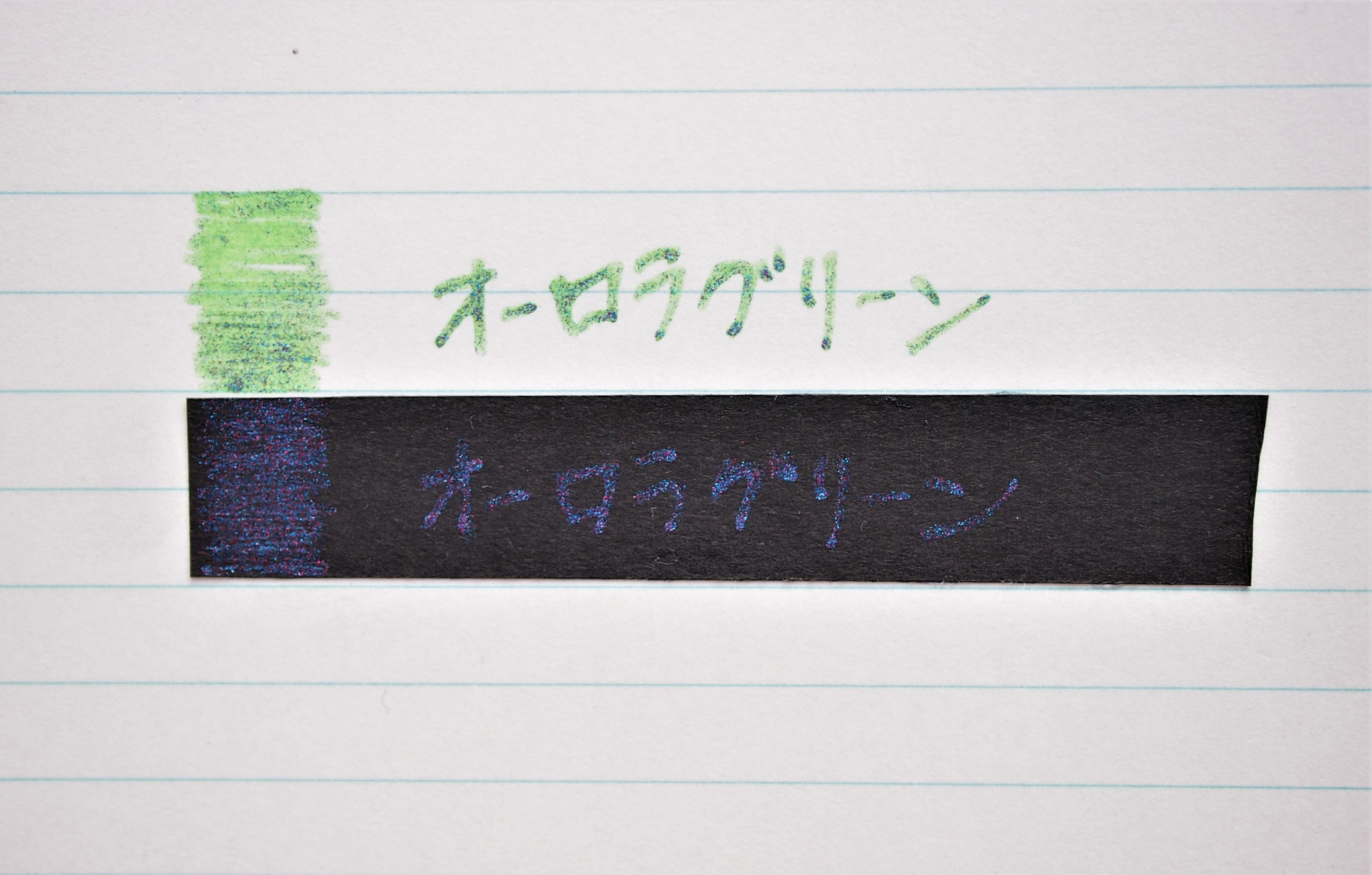 「ライトグリーン」のインクにラメ顔料の「ブルー+レッド」を合わせたインクです。