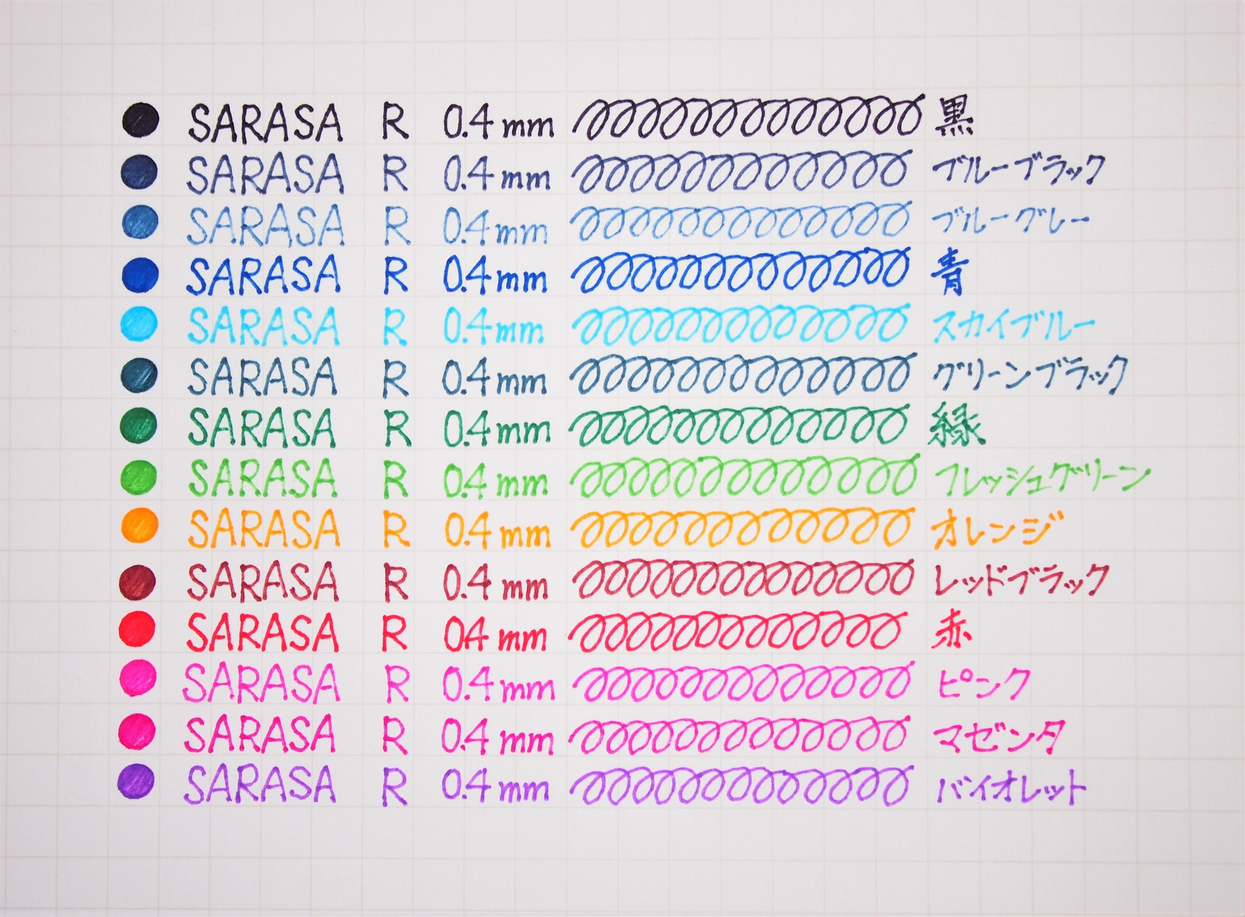 今回レビューした14色は全て0.4mm。「サラサR 」の”R”は、濃い・あざやかという英語のRichの頭文字から採っているそうです。