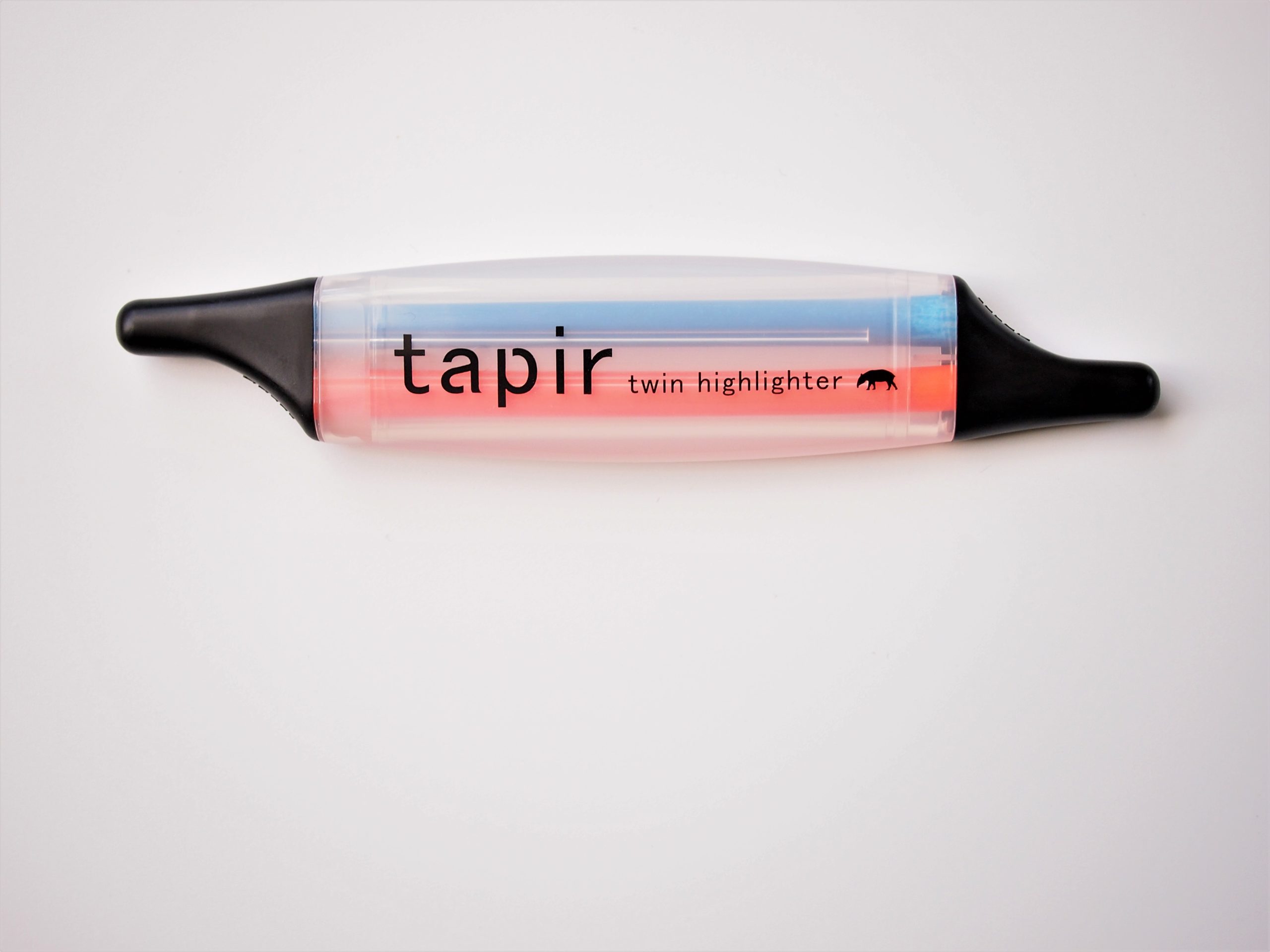 1本で2色の蛍光ペンは結構ありますけど、平たい形で透明なボディはとても面白いです。